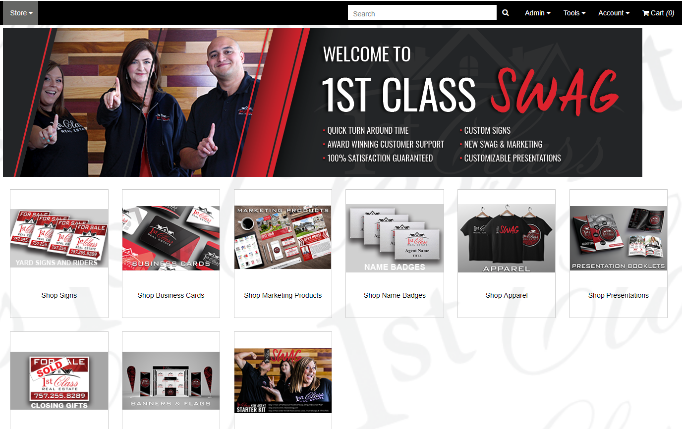 Branded and customizable signs, swag, and office essentials are just a click away. 1st Class can also add your team's designs to the swag store so your agents can quickly customize and order your branded materials!